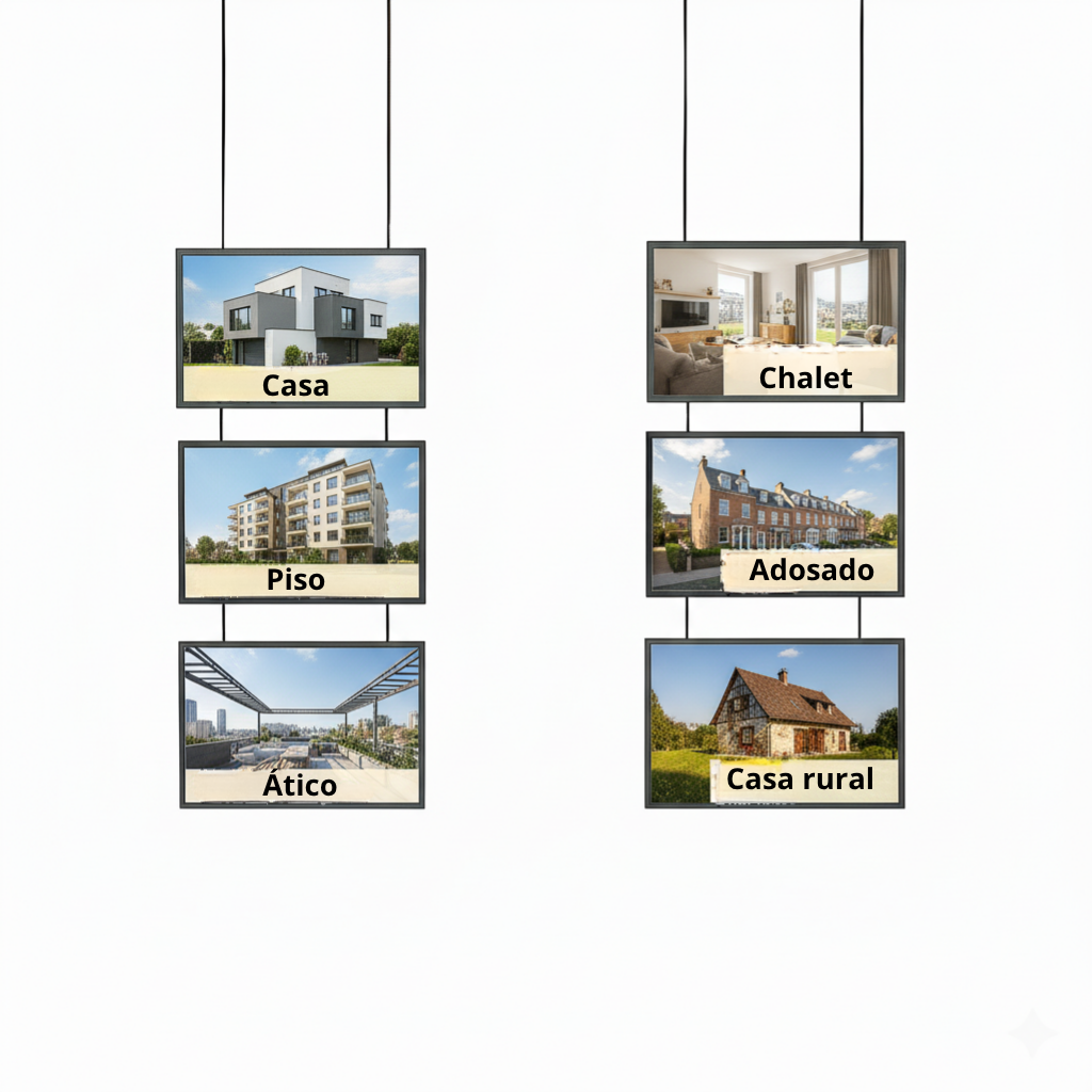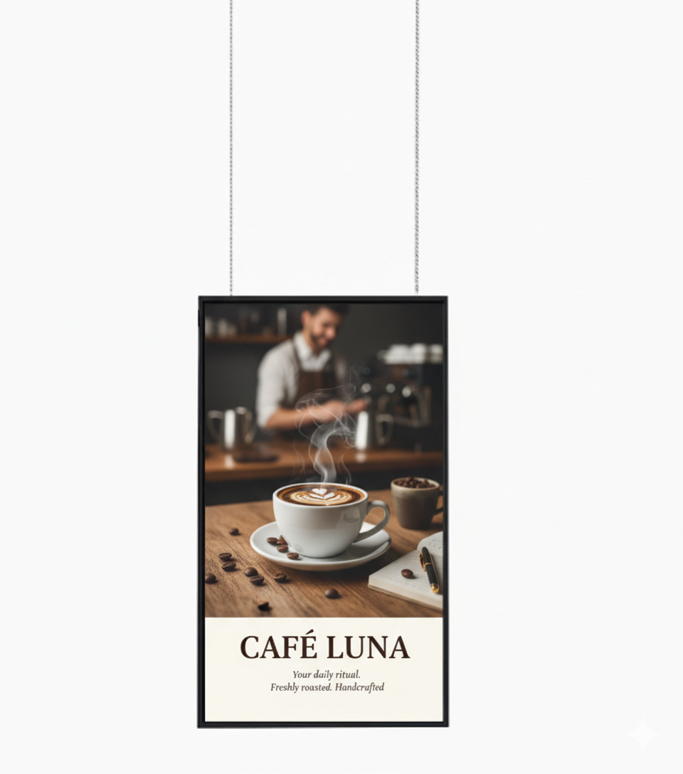 - Pantallas colgante de escaparate, perfectas para dar más visibilidad a todos tus productos o servicios a la vez.
