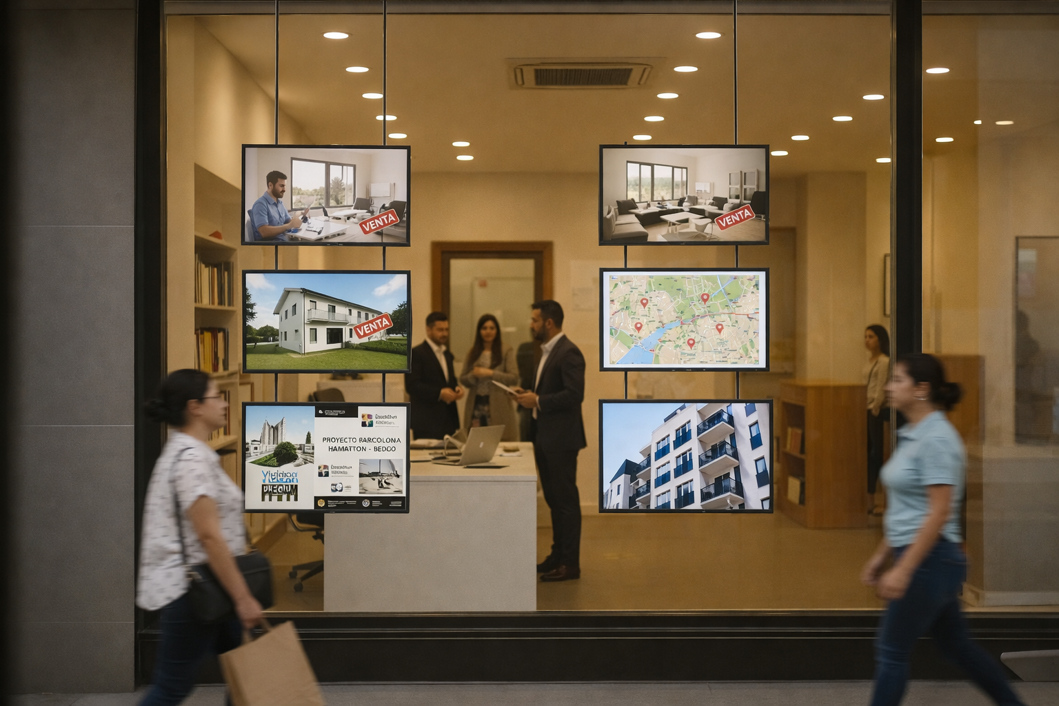 Se trata de una instalación compuesta por varias pantallas LCD de alto brillo que se colocan alineadas dentro del escaparate y se orientan hacia el exterior. Cada unidad puede funcionar de manera independiente o sincronizarse con las demás, generando una comunicación visual fluida y atractiva.